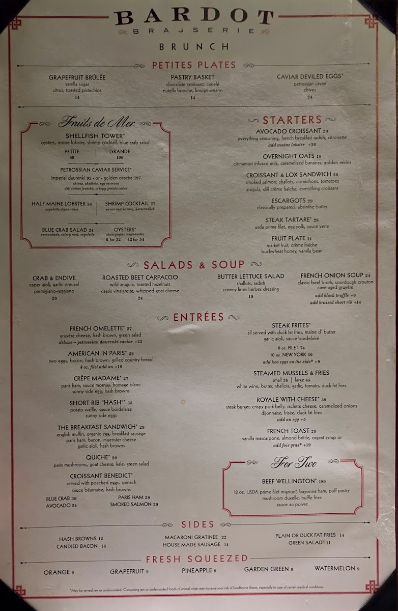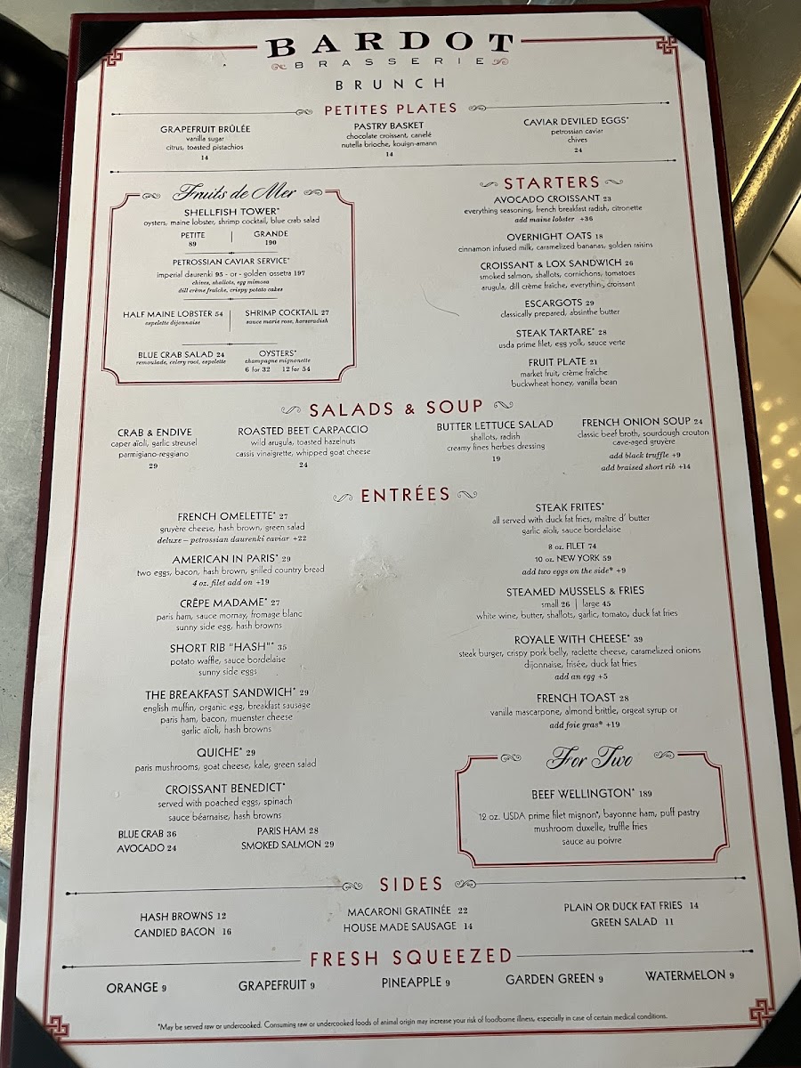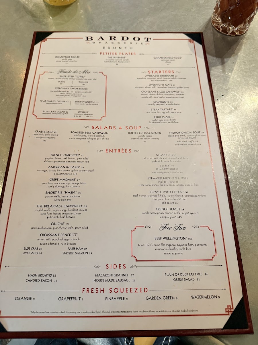 The menu at Bardot Brasserie features a selection of French-inspired dishes suitable for brunch and casual dining. It includes a variety of appetizers, main courses, and desserts that reflect classic French cuisine. Visitors can expect options such as traditional French onion soup, escargots, and a range of seafood dishes including oysters and ocean trout. The menu also offers hearty choices like short rib hash, beef Wellington for two, and roasted chicken.