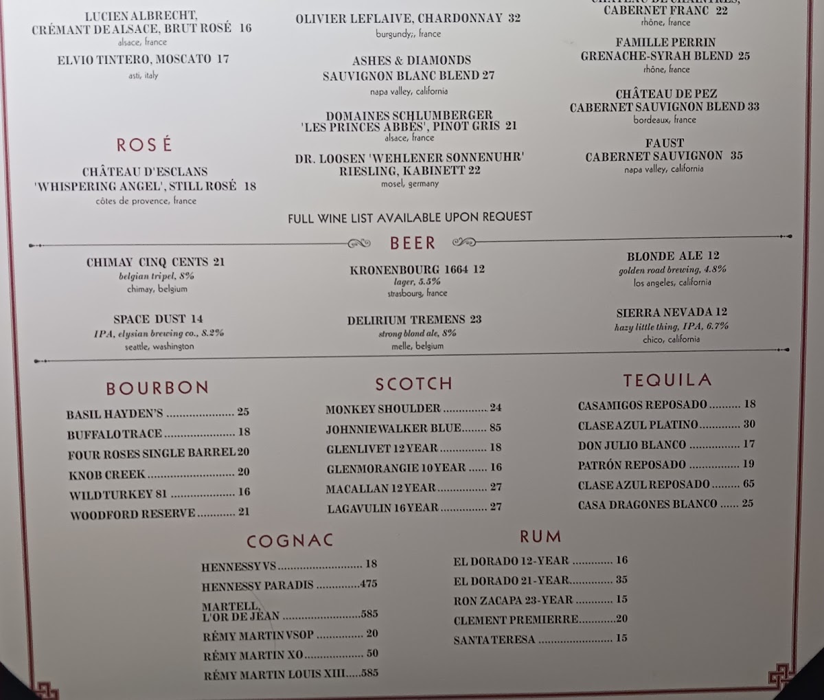 In addition to savory items, the menu presents a range of French pastries and desserts, including mille feuille, chocolate grand macaron, espresso crème brûlée, and a pastry basket. There are also light bites and delicacies such as caviar deviled eggs and foie gras.